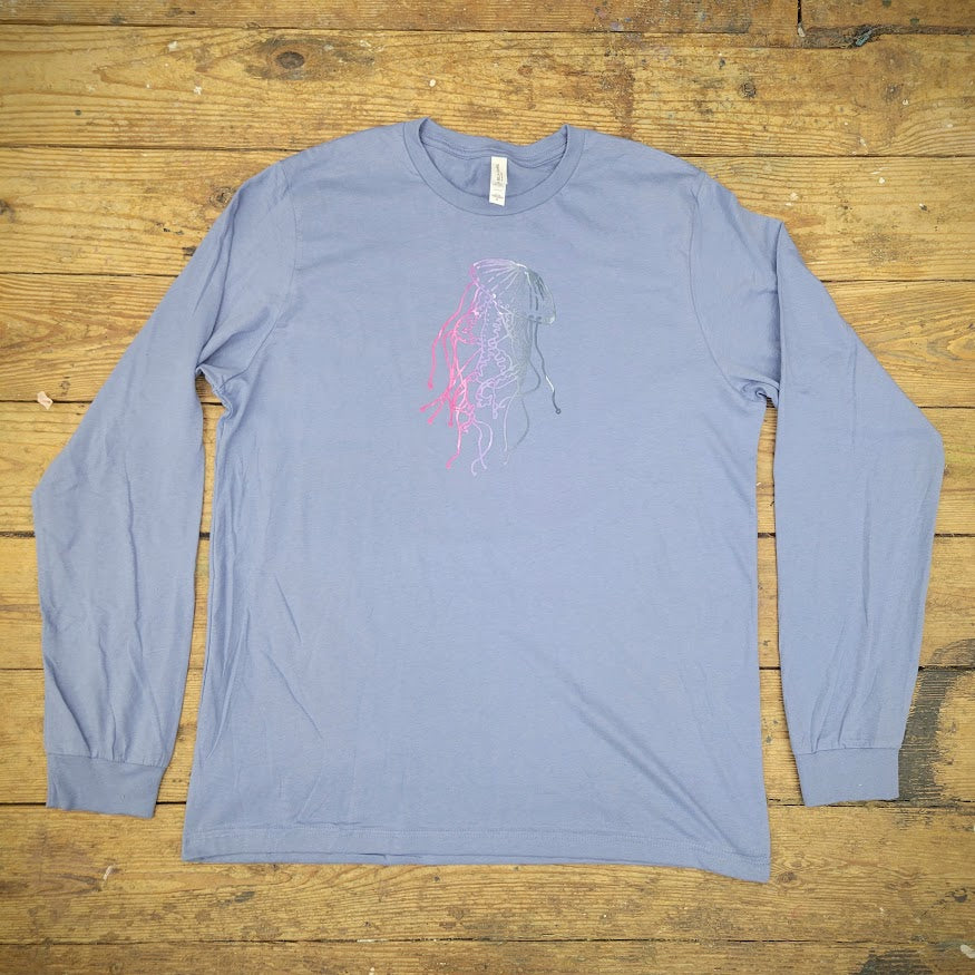 ◌ Float through your day with our Jellyfish Long Sleeve Tee! This playful unisex top features a stunning lavender blue color and a fun jellyfish design created with blended ink. Perfect for adding some unique flair to your wardrobe. (Sea-riously, you'll love it!) ◌