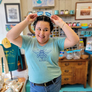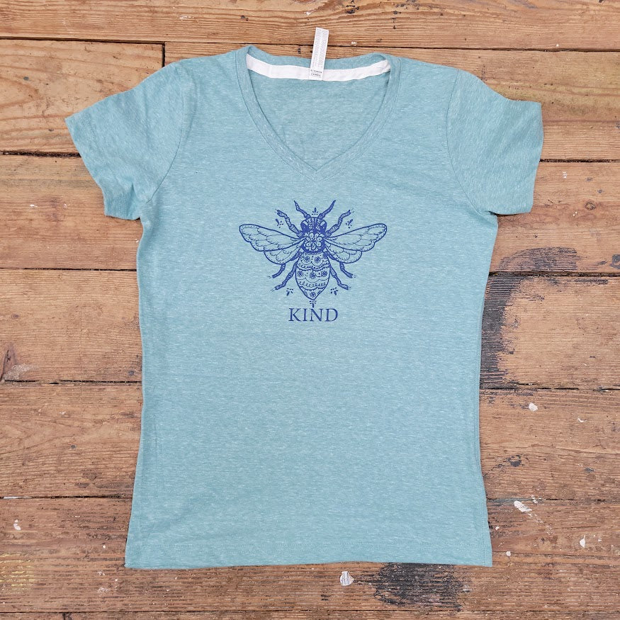 Spread kindness like bees spread pollen with our Ladies Bee Kind V-neck. This blue v-neck features a playful Bee Kind design, perfect for a fun and quirky addition to any outfit. Get one for yourself and spread the buzz of kindness!