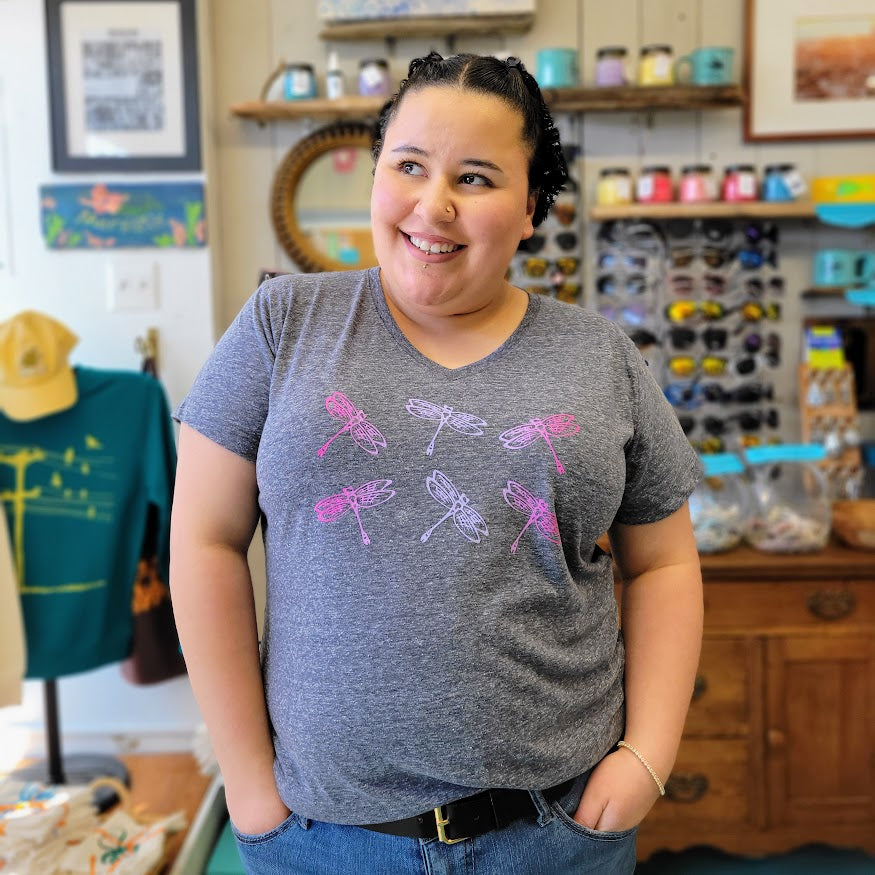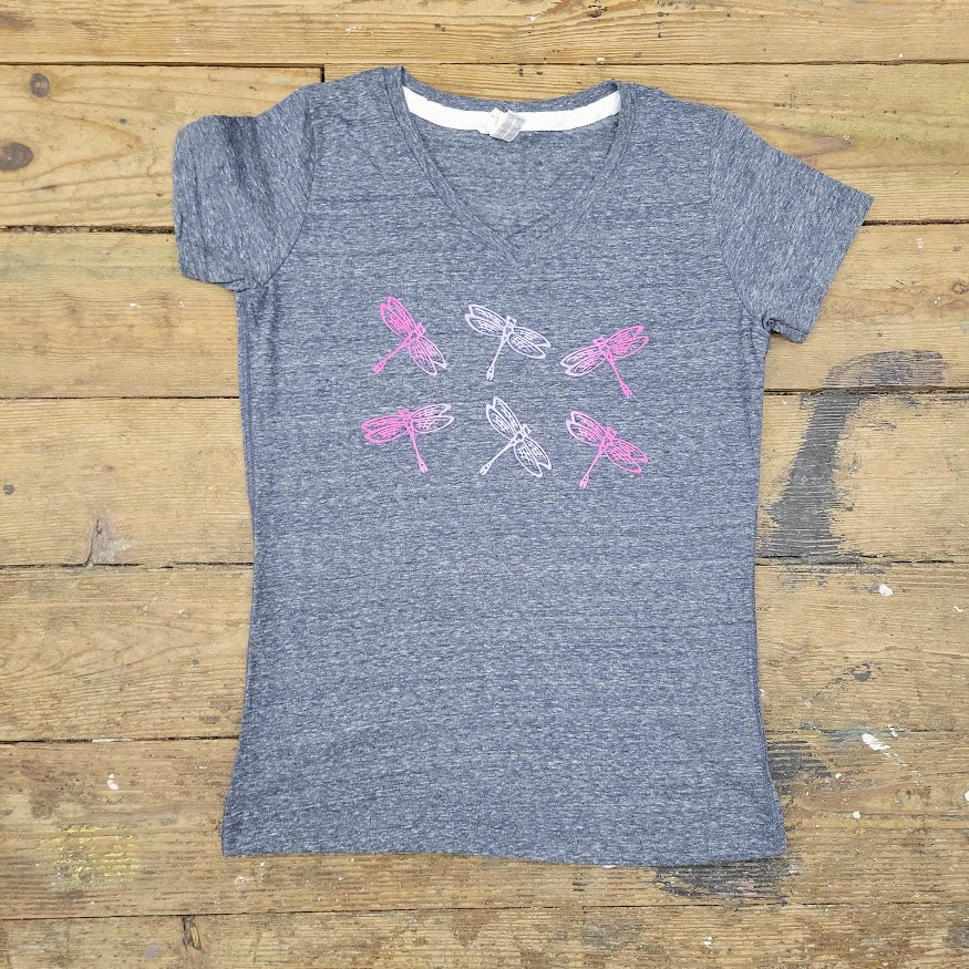 Experience your inner child with our Ladies Dragonflies V-neck. The ink fusion results in a one-of-a-kind design featuring vibrant dragonflies, all while keeping you ultra comfortable. Ideal for injecting your wardrobe with a playful touch!