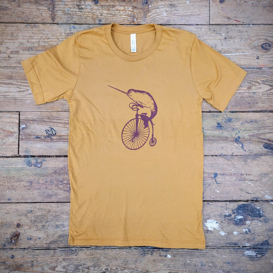 Ride in style with our Narwhal on a Penny-farthing tee! Featuring a quirky design of a narwhal riding a vintage bicycle, this toast-colored shirt is sure to turn heads. Screen-printed with plum purple ink for extra flair. Pedal into playful fashion today!