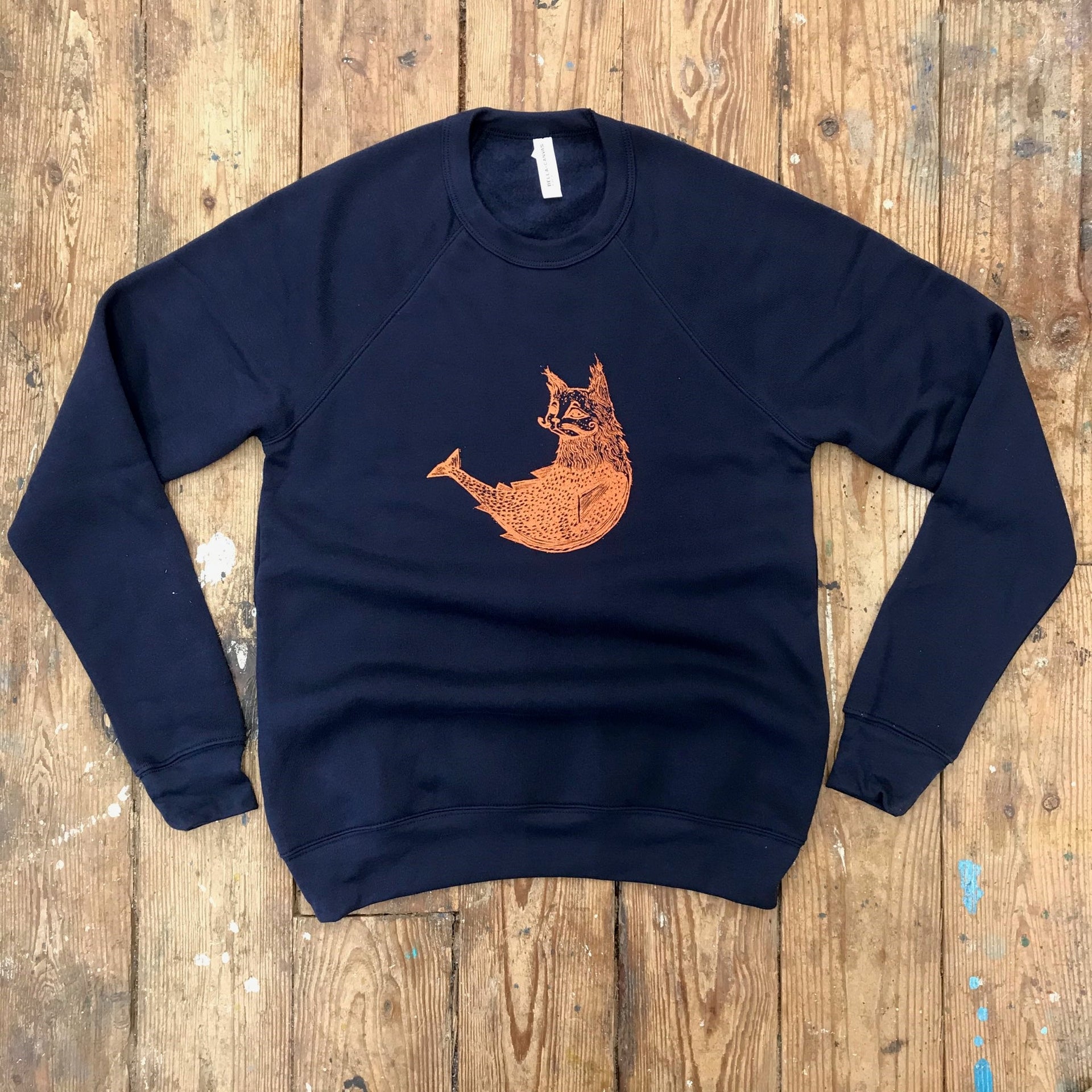 Be the life of the party in this purr-fectly stylish Cat-Fish Sweatshirt! The navy color and sponge-fleece material will keep you comfy while the screen-printed design will make everyone admire your quirky and creative fashion sense (designed by our friend Brett - you can thank them later!). Get ready to reel them in!