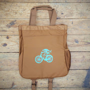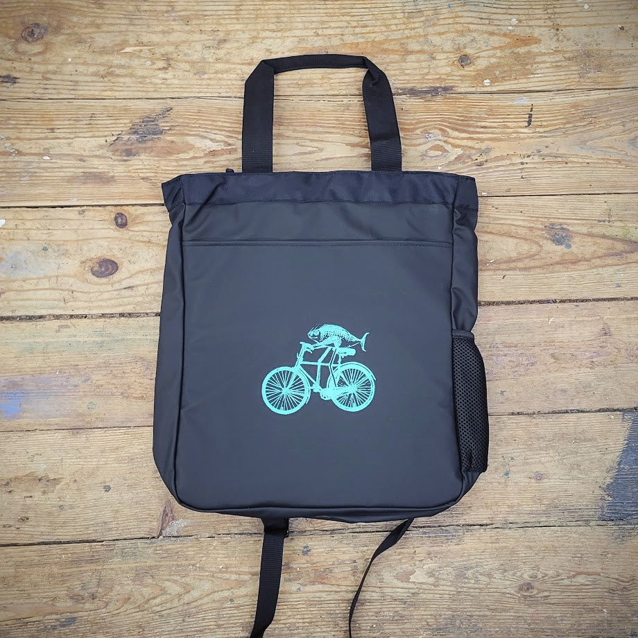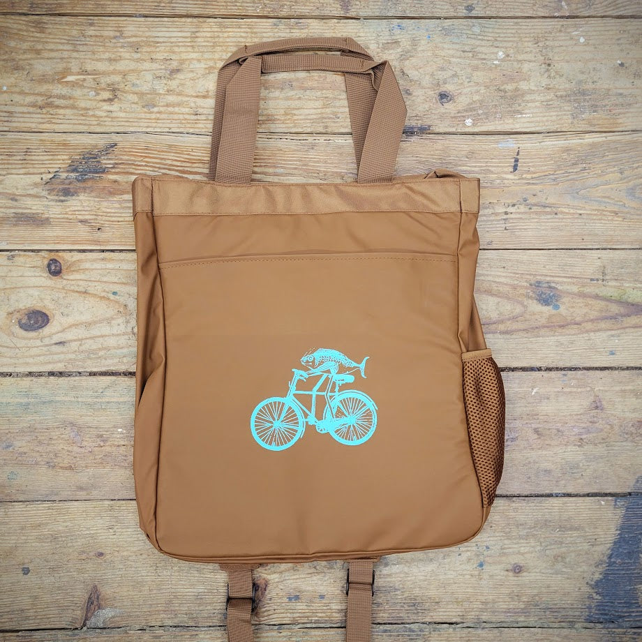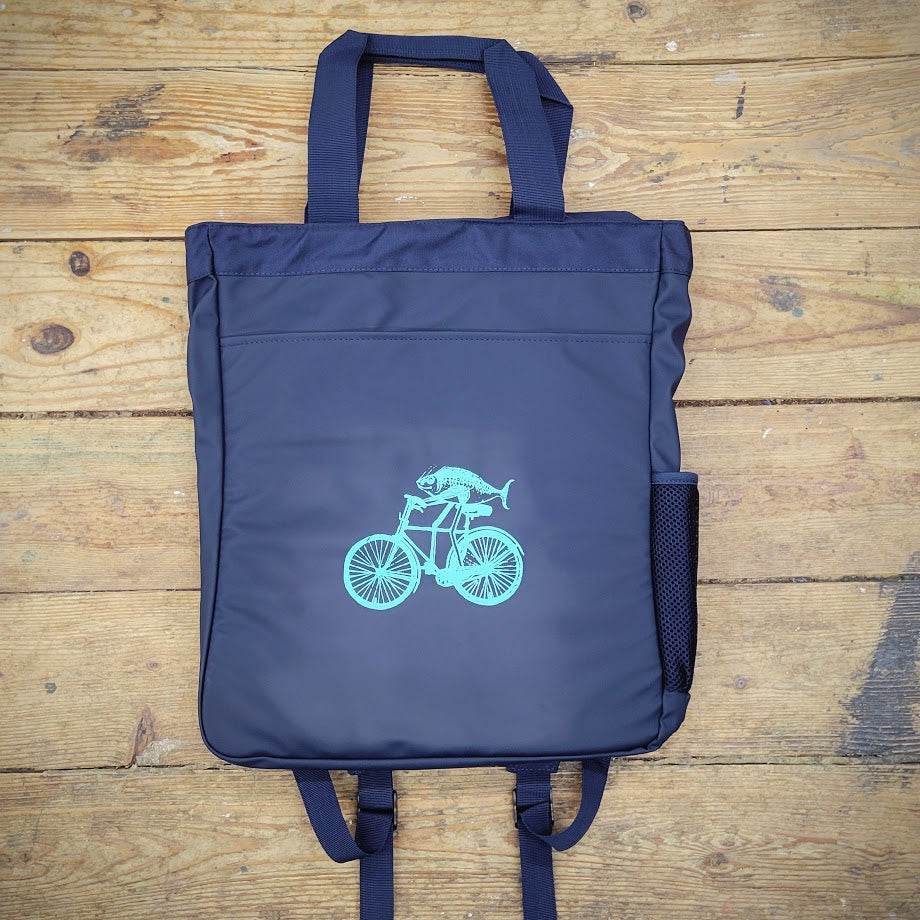 Get ready to hit the road with the Fish on a Bike laptop backpack! This innovative backpack is perfect for daily use and comes in three fun colors - navy, brown, and black. With its light-weight design, carrying your laptop has never been easier. Don't let the name fool you, this backpack is no fish out of water. This bag includes a front & back, 12" pocket that latches with velcro. You can't go wrong with the adjustable straps and water bottle holder on the left side!